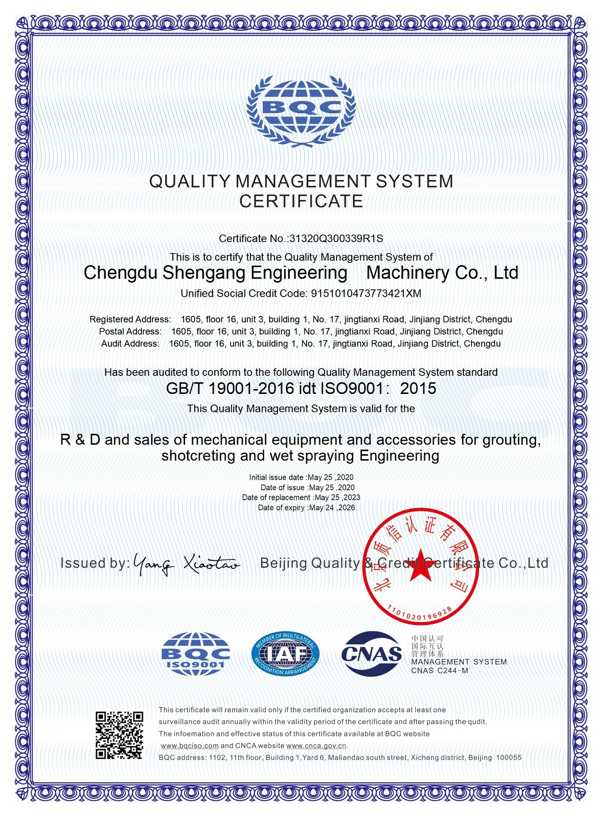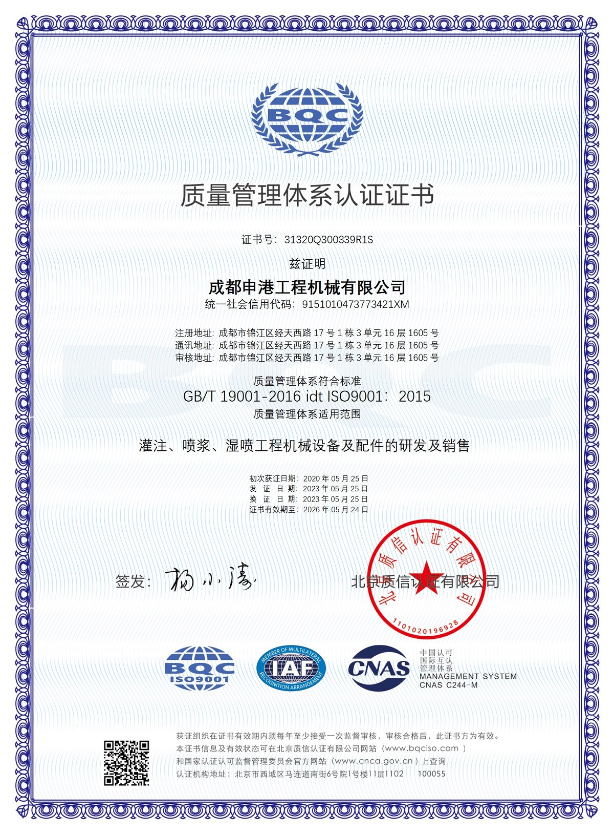 5月25日,成都申港工程機(jī)械有限公司完成《質(zhì)量管理體系認(rèn)證證書》換證工作,標(biāo)志著成都申港公司質(zhì)量管理體系工作再次得到中國(guó)質(zhì)量認(rèn)證中心關(guān)于ISO9001質(zhì)量管理體系的認(rèn)證和審核。